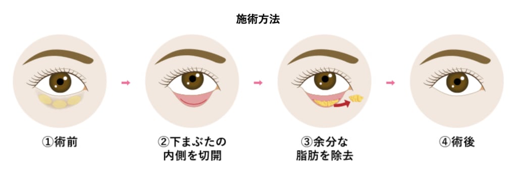 「切らない目の下のクマ・ふくらみ取り」は、目の下のふくらみの原因となる「眼窩脂肪(がんかしぼう)」を、まぶたの裏側から取り除く施術です。