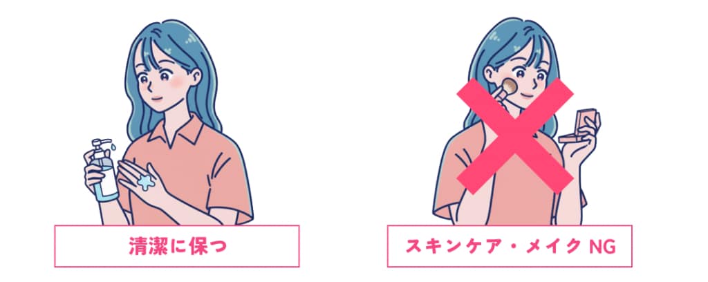 化粧品が入り込むと細菌の侵入・刺激を招きやすくなります。施術を受けたクリニックの指示が出るまでは、メイクやスキンケアは控えめに。