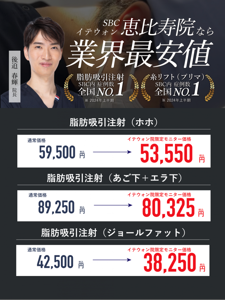 イテウォン恵比寿院では、脂肪吸引や糸リフトなどSBCのなかでも最安値のメニューを多くご用意しています。予算でお悩みの方も、後迫医師はできる限り寄り添った提案を必ずしてくれます
