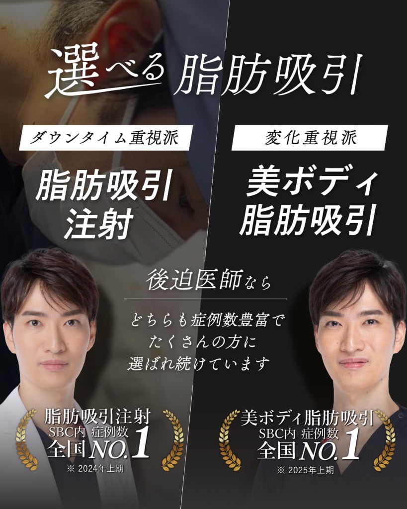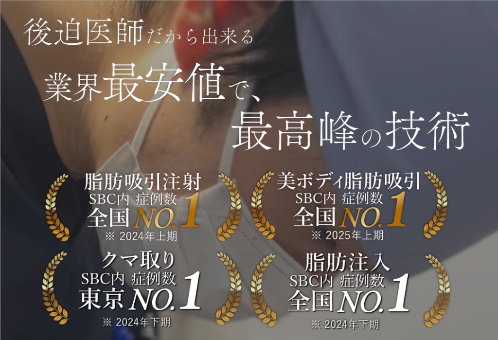 脂肪吸引おすすめドクターに認定されている後迫医師は脂肪吸引注射・脂肪吸引ともに症例数全国1位を獲得しており、症例数・経験・技術・人柄においてすべて高く評価されています。その経験をもとに、骨格や脂肪のつき方に合わせて最適なご提案をしてくれます