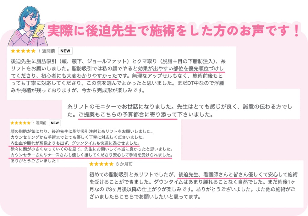 SNSや口コミで実際の体験談を確認すると安心です。後迫医師は、実際に今まで施術をしたたくさんのお客様から感謝やお褒めの口コミをいただいております。