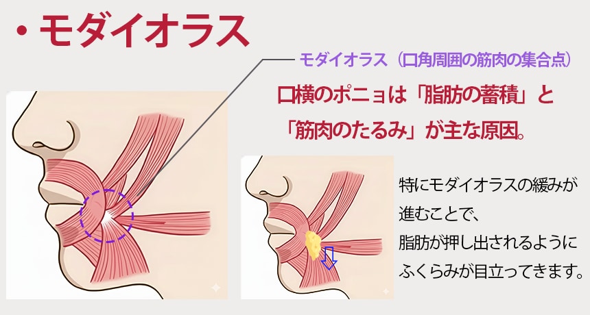実は、口横の印象を左右するのは「モダイオラス」という筋肉の場合があります。