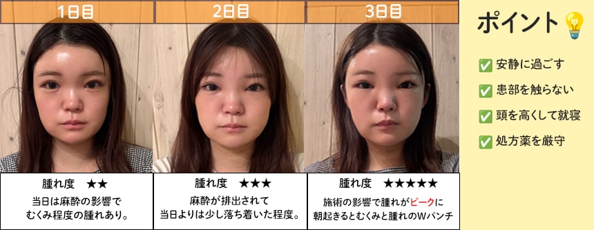 ※腫れのピークは3日前後ですが、多くの方がマスクでカバー可能な範囲です。