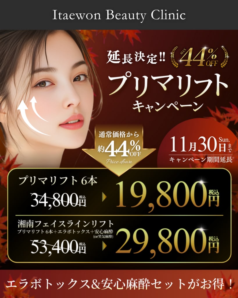 糸リフトキャンペーンは11月末までの期間限定となっておりますので、ぜひお得に施術されてくださいね!