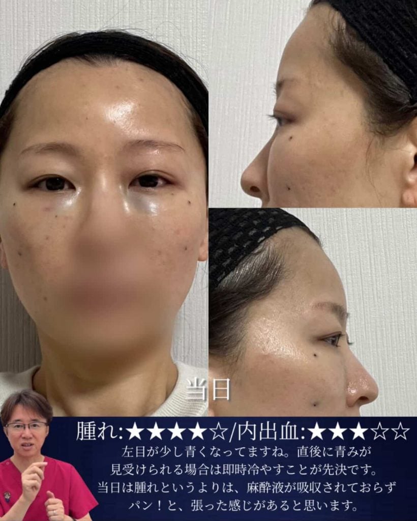 施術の副作用(リスク):だるさ・熱感・頭痛・蕁麻疹・痒み・むくみ・発熱・咳・冷や汗・胸痛・膨らみが残る・まぶたが凹みすぎたと感じる・膨らみや凹み具合など、仕上がりに左右差があると感じる・目がゴロゴロする・若返り効果が物足りない・小ジワ・シワ・たるみが残る、または増加する・目尻がつっぱるなどを生じることがあります。