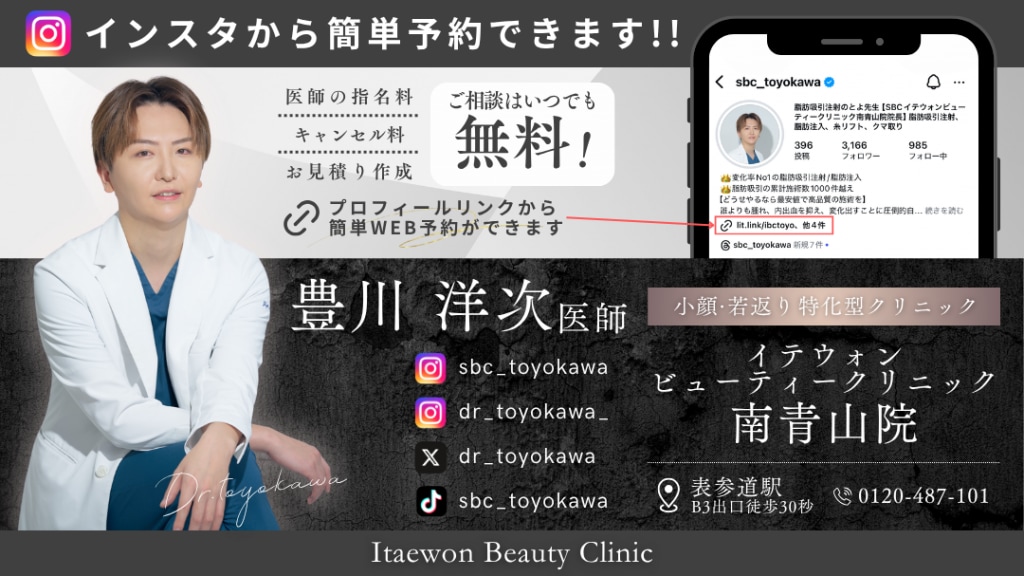 イテウォンビューティークリニック南青山院のとよ先生はダウンタイム最小限の脂肪吸引注射で劇的な別人級変化出す施術を得意としています。