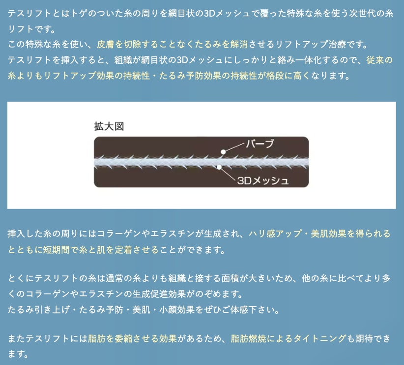 トゲのついた糸の周りを網目状の3Dメッシュで覆った特殊な糸を使う次世代の糸リフト