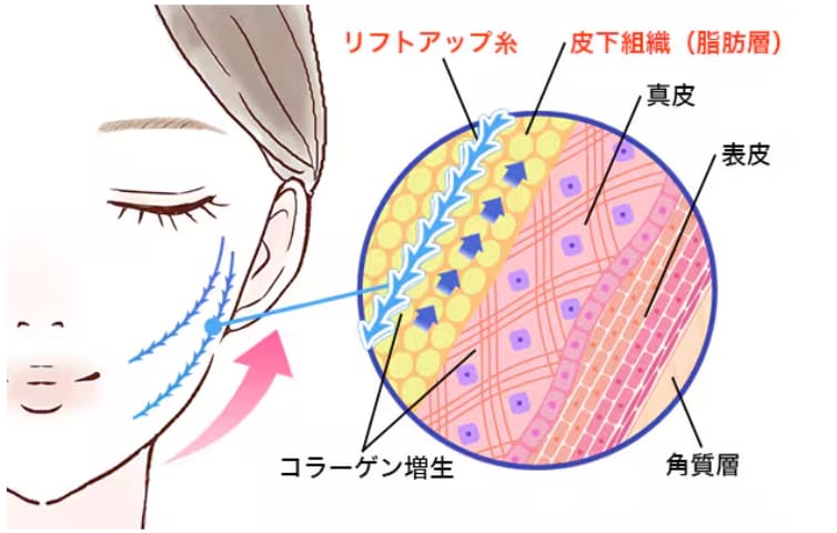 3Dメッシュ状の糸が皮下組織と一体となることで、従来よりも強力で長続きするリフトアップ効果を得ることができる
