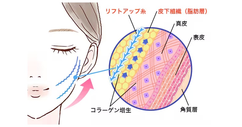 糸リフトは、糸のコグ(トゲ)を皮下脂肪に引っかけて引き上げる施術です。