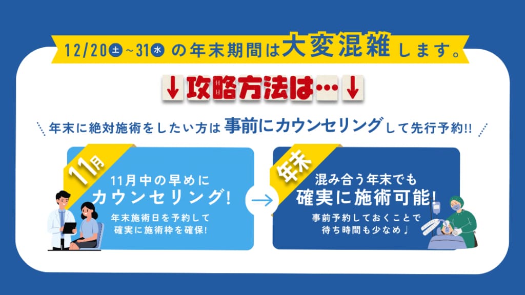 できるだけ早めに11月中にカウンセリングへお越しいただき施術日の先行予約をおすすめいたします。