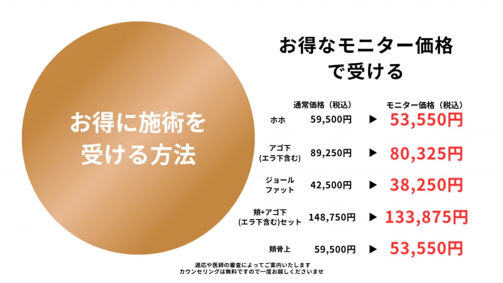 表をみていただいてわかる通り、モニター価格でしたら脂肪吸引注射が 3万円台(ジョールファット)