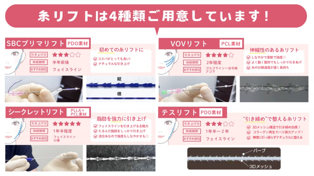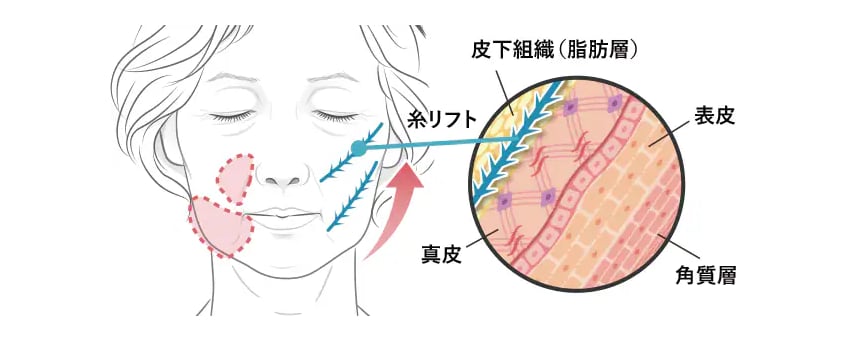 糸リフトは、コグ(トゲ)の付いた専用の糸を皮下に挿入し、