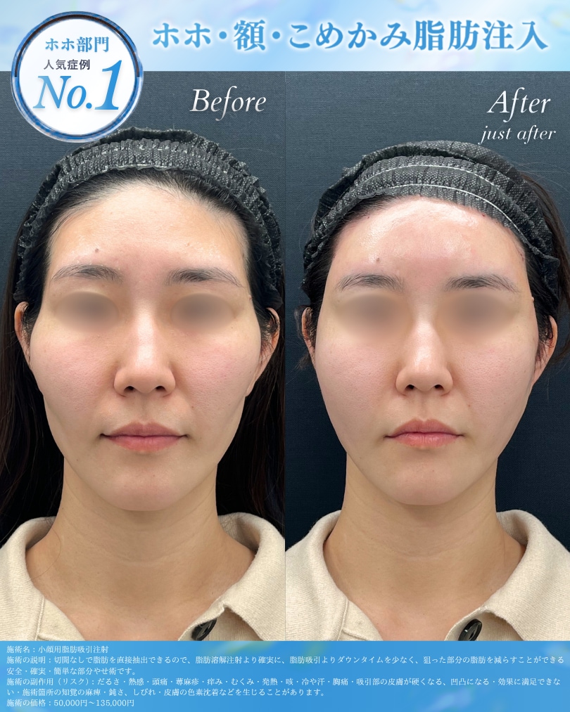 一度定着した脂肪細胞は、そのままご自身の組織として残ります。基本的には必ず無くなってしまうヒアルロン酸とは異なり、長期的なコストパフォーマンスにも優れています。 - 若返りと部分痩せが同時に叶う