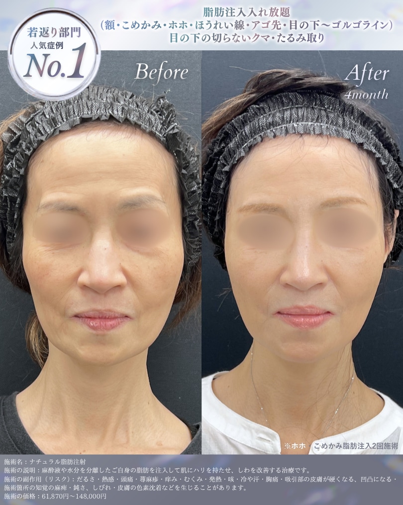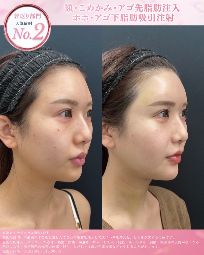 太ももなど気になる部分から脂肪を採取し、お顔の凹みに注入するため、ボディラインの整えと若返りが同時に実現します。