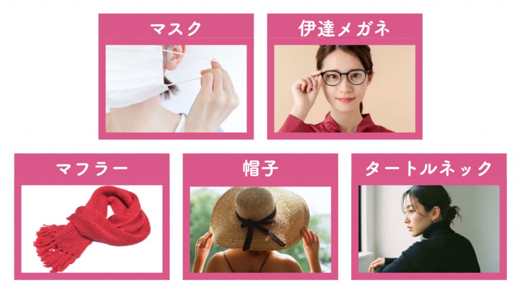 顔の脂肪吸引の場合、今の時代はマスクが必須アイテムです。マスクをしていても不自然ではないため、フェイスバンドや内出血を隠すには最適です。さらに冬場であれば、マフラーやタートルネックなども腫れを隠せるアイテムになります。また、あえてツバの広い帽子や伊達メガネをかけることで、相手の視線を患部から逸らすテクニックも有効です。