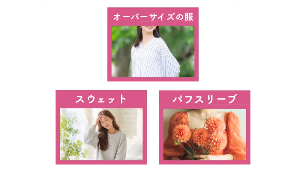 二の腕の圧迫着(ボレロ)を隠すには、オーバーサイズファッションがおすすめです。袖にボリュームのあるパフスリーブのブラウスや、ゆったりとしたスウェットを選べば、圧迫着の厚みやラインを拾うことはありません。室内でどうしても薄着になる必要がある場合は、カーディガンを常に肩掛けしておくと自然に腕を隠すことができます。圧迫着の着用が大体3日間程は必須なことが多く、さらにその期間中はシャワーができないので、施術時期は秋〜冬の方がバレにくいでしょう。