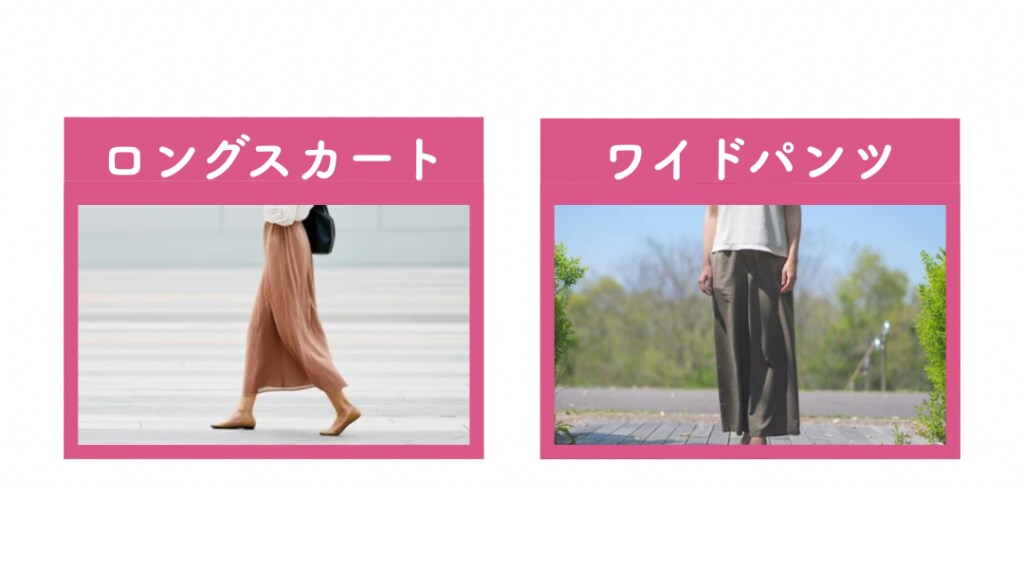 下半身のダウンタイム隠しには、ロングスカートやワイドパンツが最強のアイテムです。特にフレアスカートのような足のラインが出ないものを選べば、厚手のガードルを履いていても全く気づかれません。素材は体のラインを拾わない、少しハリのある厚手の生地を選ぶのがポイントです。