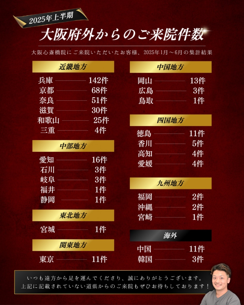 じゅうま先生の技術を求めて、クリニックには関西エリア(大阪・神戸・京都)の方はもちろん、東京、名古屋、福岡、遠くは沖縄など、全国各地から多くの患者様がご来院されています🗾