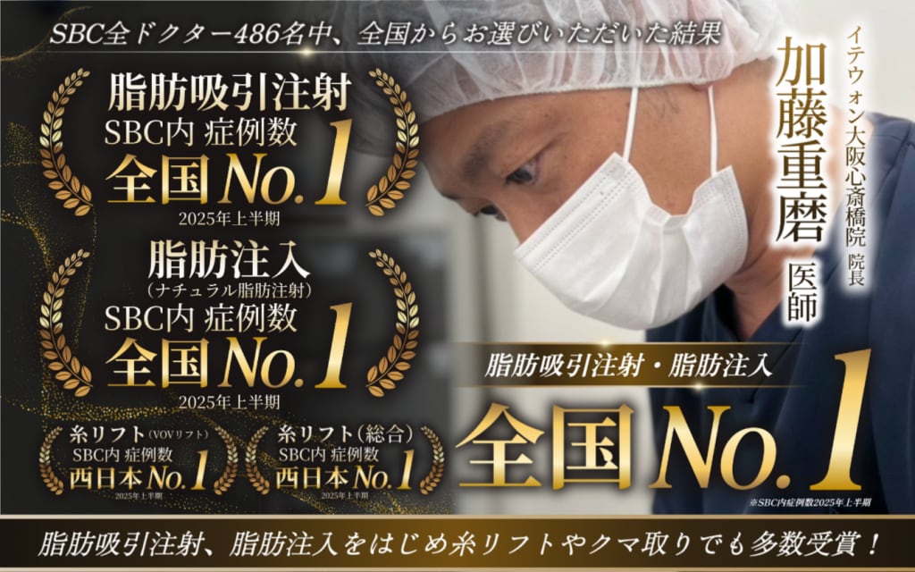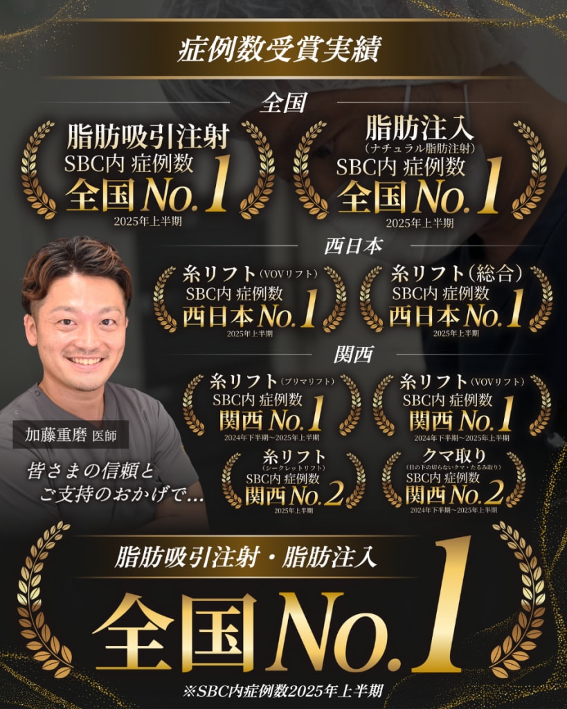 🥇脂肪吸引注射 全国No.1 🥇脂肪注入(ナチュラル脂肪注射) 全国No.1 🥇糸リフト(総合) 西日本No.1 🥇糸リフト(VOVリフト) 西日本No.1 🥇糸リフト(プリマリフト) 関西No.1 🥈糸リフト(シークレットリフト) 関西No.2 🥈目の下の切らないクマ・たるみ取り 関西No.1