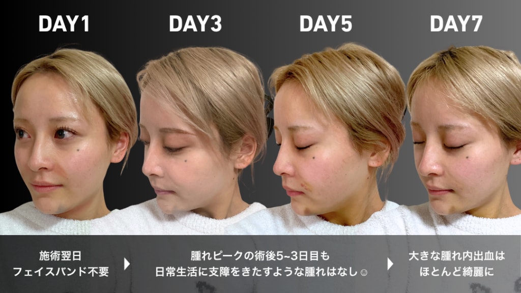 目立った腫れや内出血はほとんど出ておらず、当日からメイクやマスクで隠せる程度です。