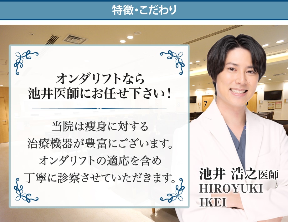 オンダリフト(ONDA PRO)とは脂肪を溶かして顔や気になる体のボリュームダウンが期待できる最新小顔・痩身治療です。オンダリフトとは、世界初の特許を取得した特殊なマイクロ波を照射することで脂肪減少に効果が期待できる治療です。マイクロ波2.45GHzによって、肌表面へのダメージを最小限に抑え、脂肪層へ効率的に熱を届けることができる機器です。脂肪減少効果とマイクロ波の熱刺激により、皮膚表面のタイトニング・リフティングが期待できます。痛みやダウンタイムも少ない為、安心して施術をお受けいただけます。カウンセリングで内容をご確認いただいた上で、モニター特別価格にて施術をお受けいただけます。