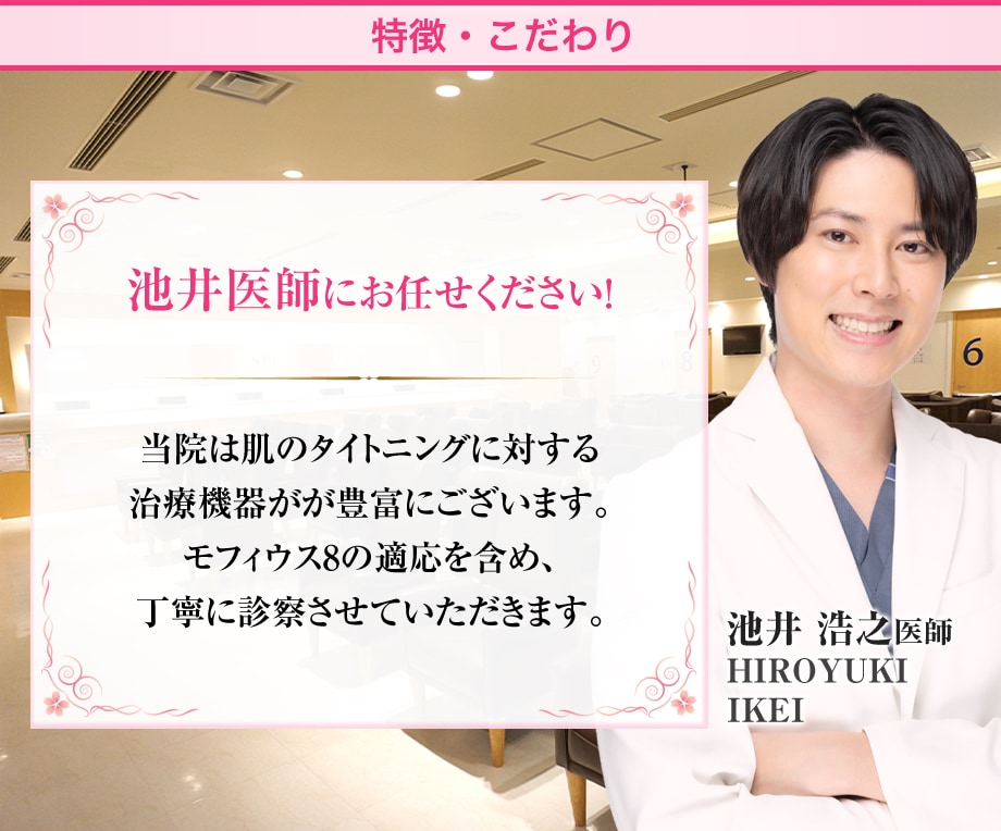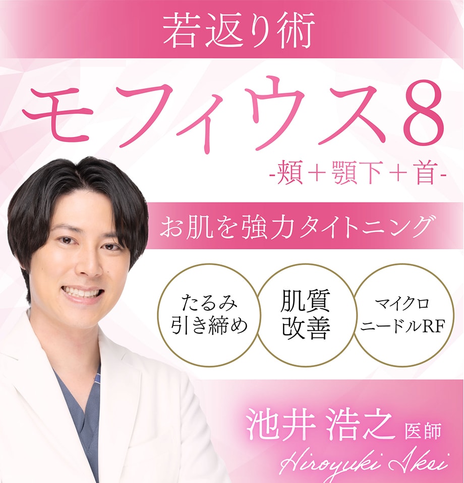ポテンツァやシルファームなどもマイクロニードルRFの一種ですが、モフィウス8は真皮~皮下組織・皮膚表面までの広い皮膚構造に向かって熱を照射できるという点で、強いタイトニング効果が期待できる注目の機器です。