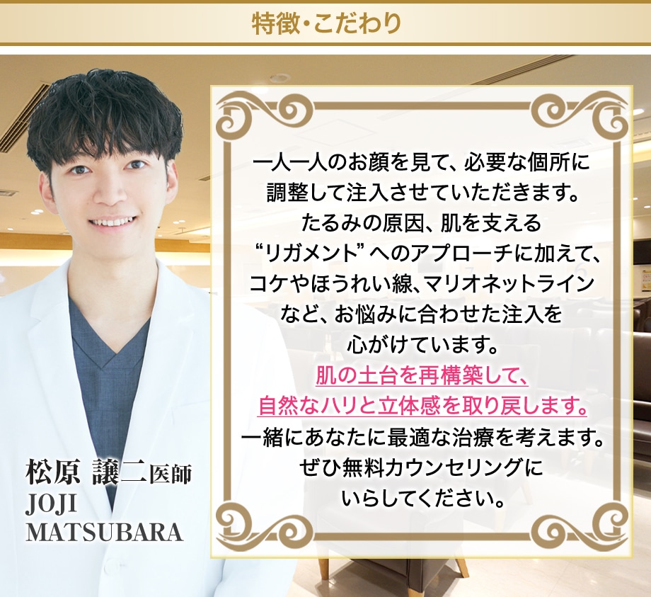 ジャルプロスーパーハイドロとは、非架橋ヒアルロン酸、7種類のアミノ酸、3種のペプチドという3つの主成分が、皮膚や脂肪を支える土台となるリガメント(靭帯)を強化し、肌質改善やハリ・弾力、リフトアップ、タイトニング等の効果をもたらします。