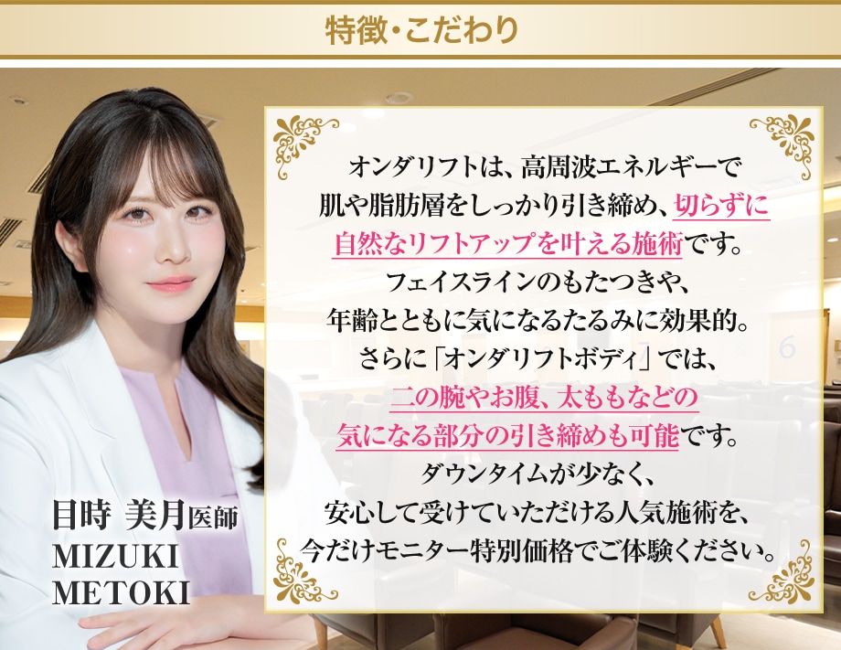 オンダリフトとは、世界初の特許を取得した特殊なマイクロ波を照射することで脂肪減少に効果が期待できる治療です。