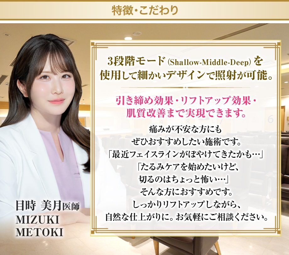 同時照射の技術により脂肪層の深部にまで熱エネルギーを届けることができ引き締め効果に加えリフトアップ効果も実感できる機械です。