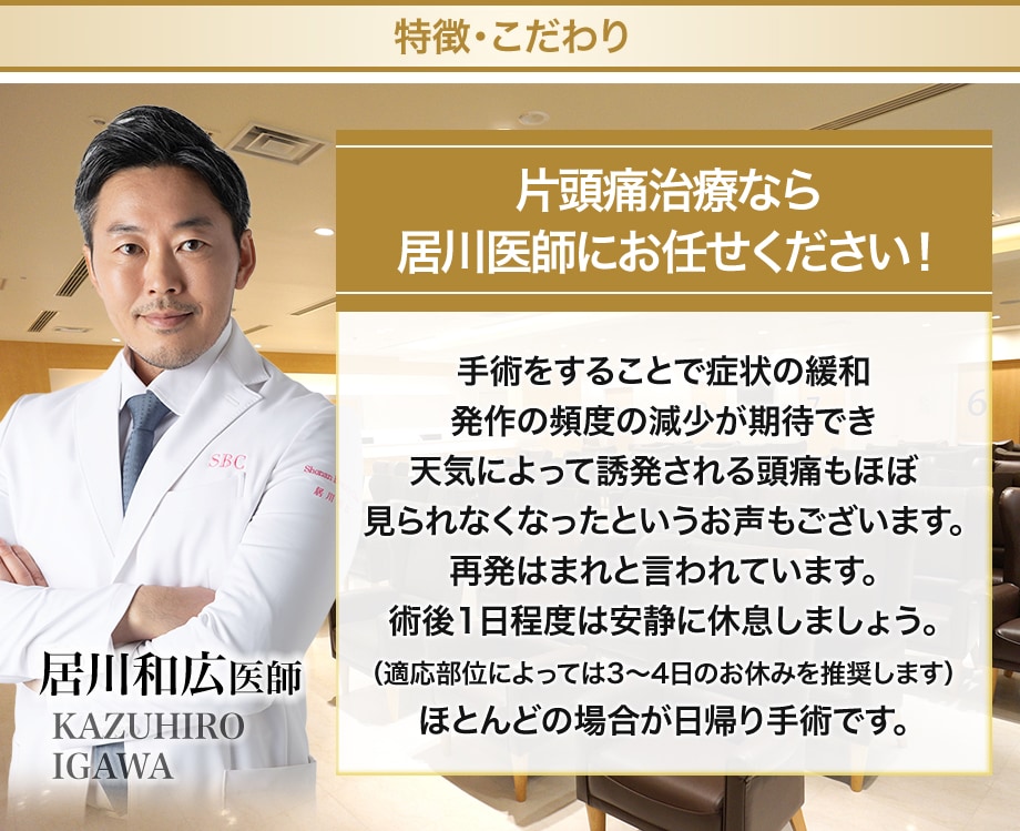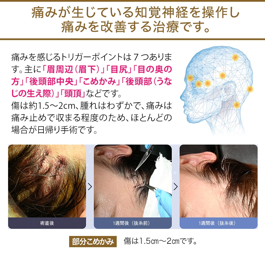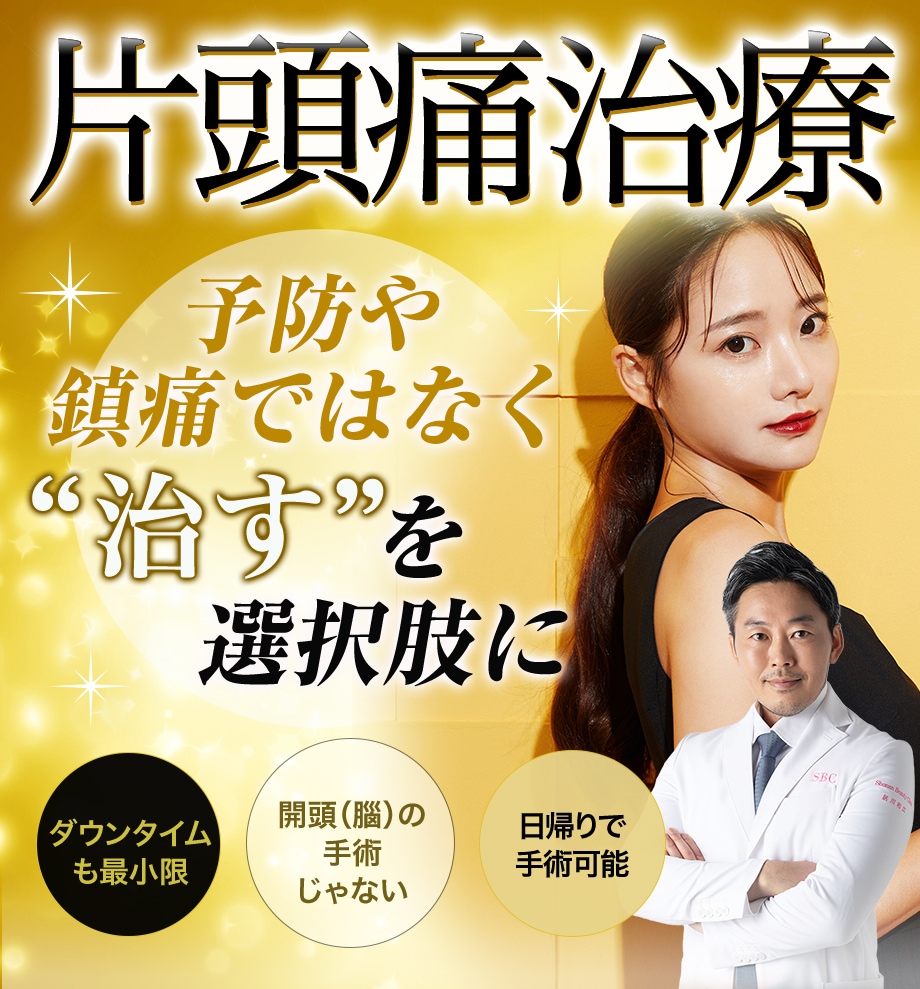 「片頭痛の治療」と聞くと脳や頭蓋骨内のような大きな手術とイメージされるかもしれませんが、片頭痛は、知覚神経が血管や組織に圧迫され生じうるもの。SBC湘南美容クリニックの片頭痛治療は、痛みが生じている知覚神経を操作し、痛みを改善する治療です。顔面神経とはまったく関係のない神経を操作するので顔面麻痺のリスクはありません。