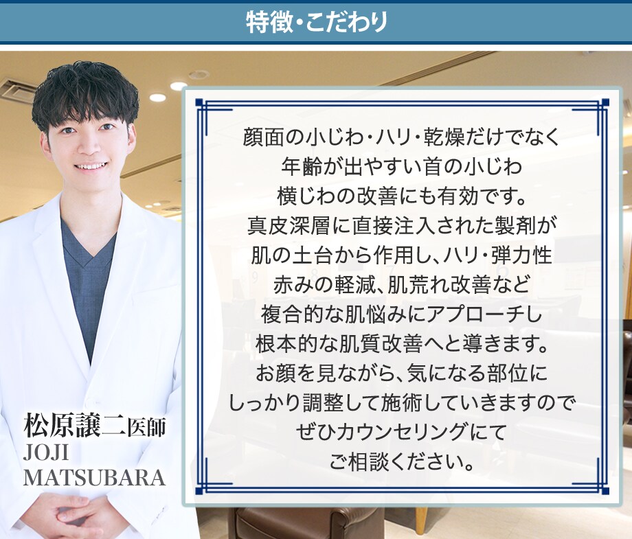 真皮深層から皮下に注入することで、肌の奥深くから小じわを改善し、ハリ・弾力、保水力を向上させ、肌荒れや赤みの軽減までをサポートします。
