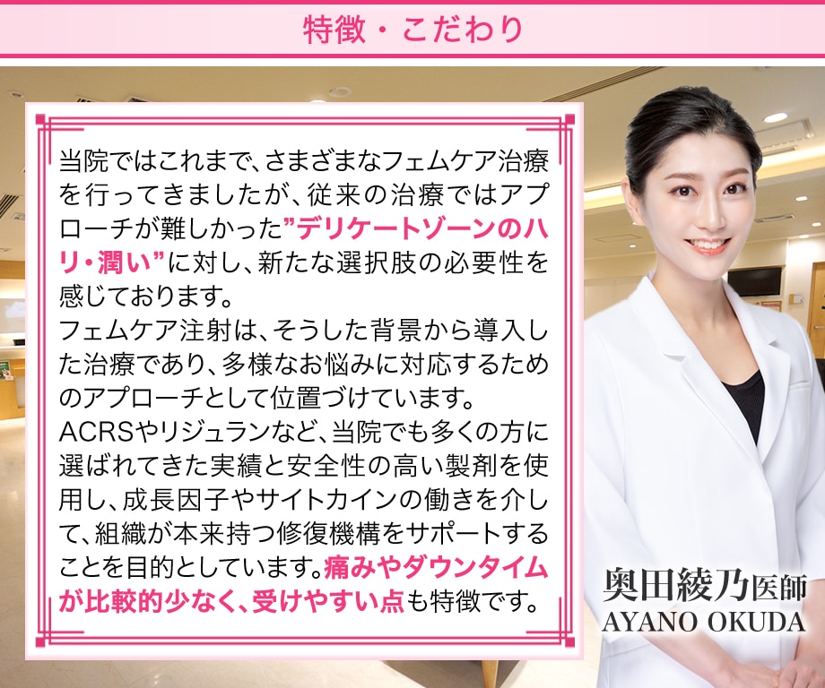 フェムケア注射は、ACRSやリジュランをデリケートゾーン(大陰唇・鼠径部・膣入口・膣内・Gスポット)に注入することで、うるおい・ハリ・弾力を与え、再生を促す治療です。乾燥や黒ずみ(色素沈着)、シワ、不快感、かゆみなどのお悩みにアプローチし、しっとり・ふかふかした質感へ導きます。切らずに受けられる、最新のアンチエイジングフェムケア治療です。