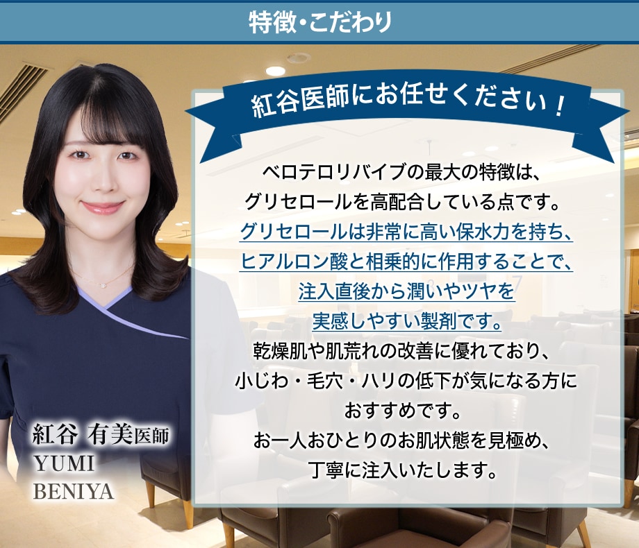 ベロテロリバイブは、架橋ヒアルロン酸とグリセロールという2つの主要成分からなる注入製剤です。肌の「内側から潤いとハリを再生する」ことを目的としています。