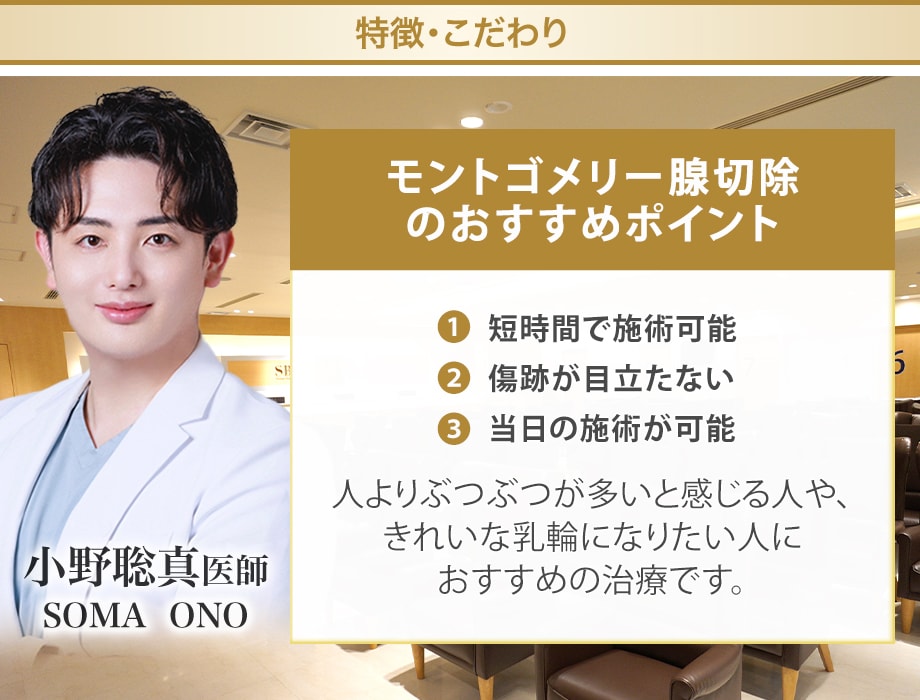 しかし、モントゴメリー腺が発達しすぎて必要以上に大きくなってしまうことがあります。当院では、体に害のない範囲でモントゴメリー腺をメスで排除し、極細の糸で丁寧に縫合いたします。そのため傷痕をほとんど残すことなくきれいなバストを保つことが出来ます。