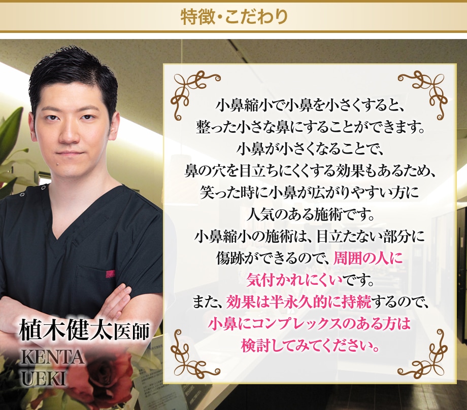 横幅を狭くしたい、側面張り出しを改善したい、鼻の穴を小さくしたい、鼻の穴を目立たなくしたい、小さい鼻にしたい、可愛い鼻にしたいなどの要望に応えることが可能です。