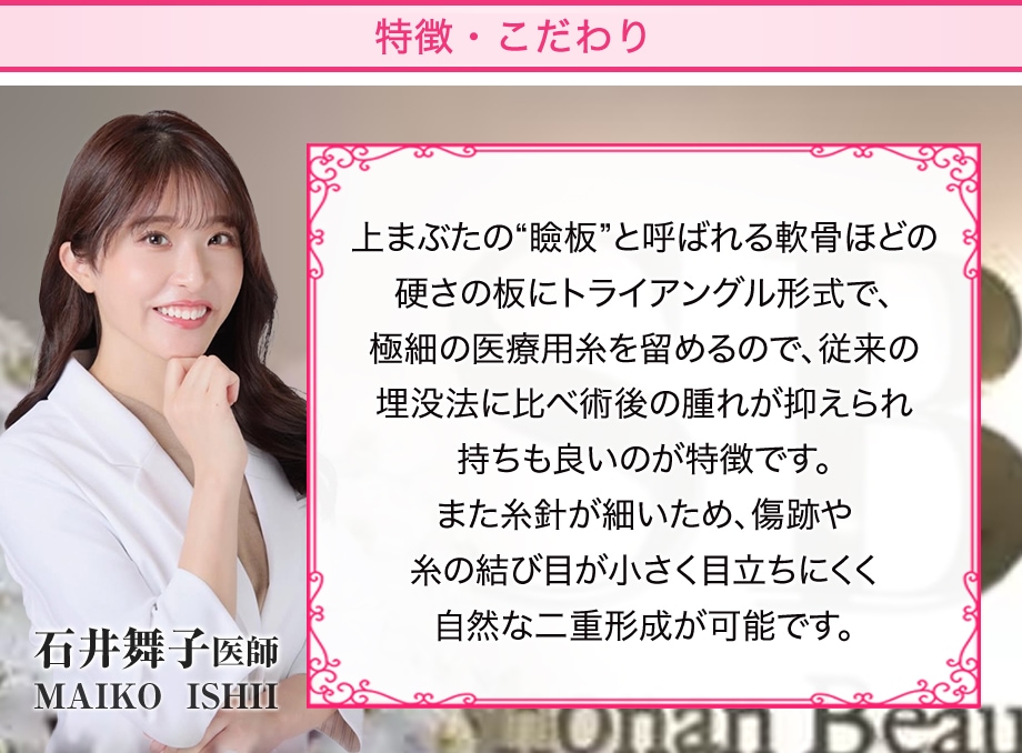 二重のラインとなる皮膚の部分をまぶたの内側から留めるだけなので、傷も見えず、抜糸の必要もありません。