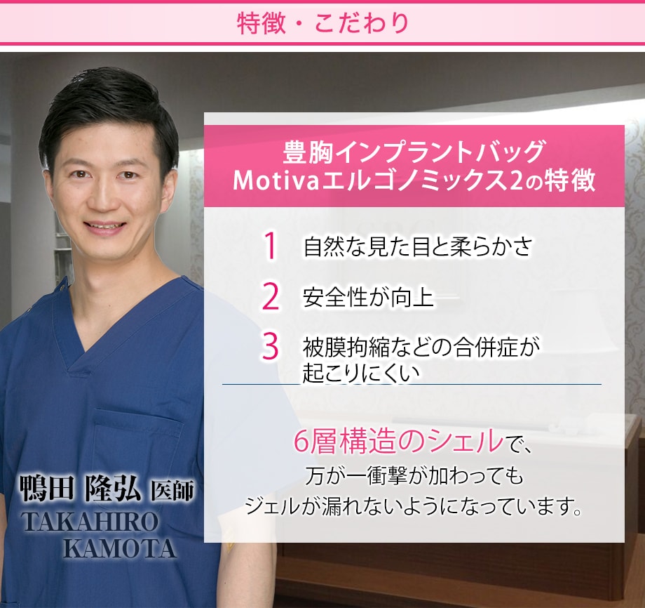 ベテラン外科専門医、Dr.鴨田による週末豊胸 -ピュアグラフト-・コンデンスリッチ脂肪注入豊胸・豊胸インプラントバッグMotivaエルゴノミックス2がお手頃な価格で受けられます!