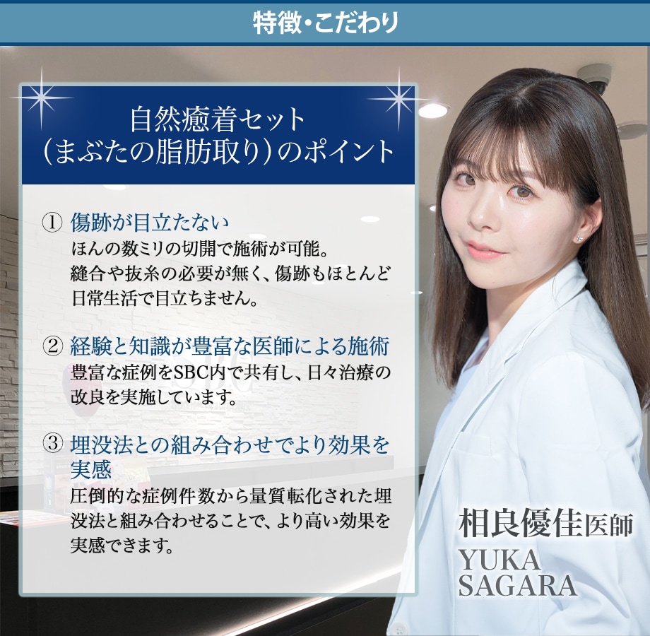 まぶたの腫れぼったさをなくして、目の上をスッキリさせたい方は、まぶたの脂肪を直接除去する「自然癒着セット(まぶたの脂肪取り)」がおすすめです。まぶたの場合は、脂肪吸引ではなく「脂肪除去」が適用されます。