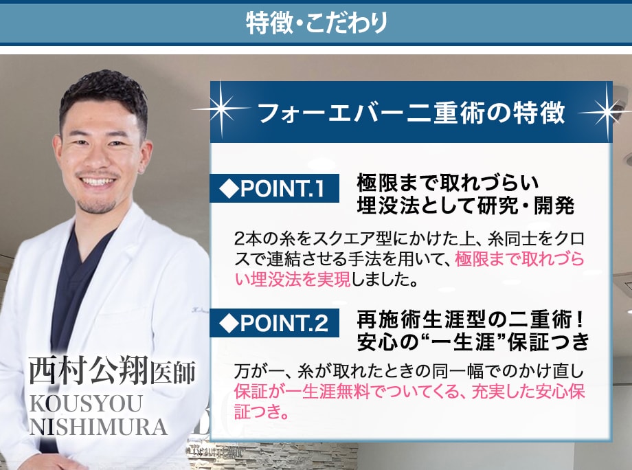 スクエア型に糸をかけることで眼瞼内組織への圧を分散させることができ、同時に糸2本をクロスさせることで極限まで取れづらい埋没法を実現しました。
