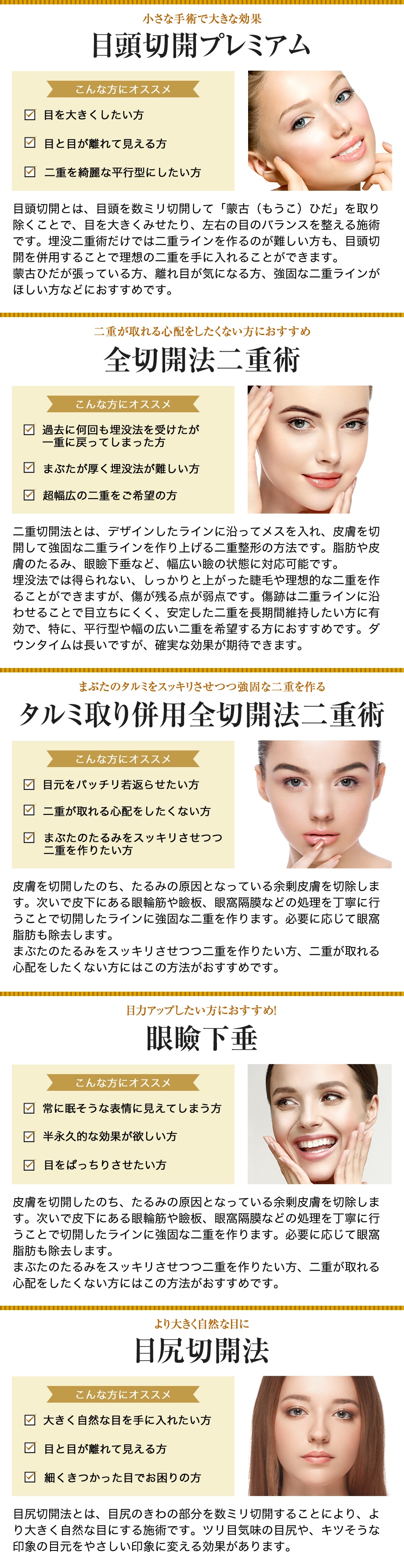 目頭切開・全切開・眼瞼下垂・目尻切開など、お一人おひとりに合った施術をご提案します。