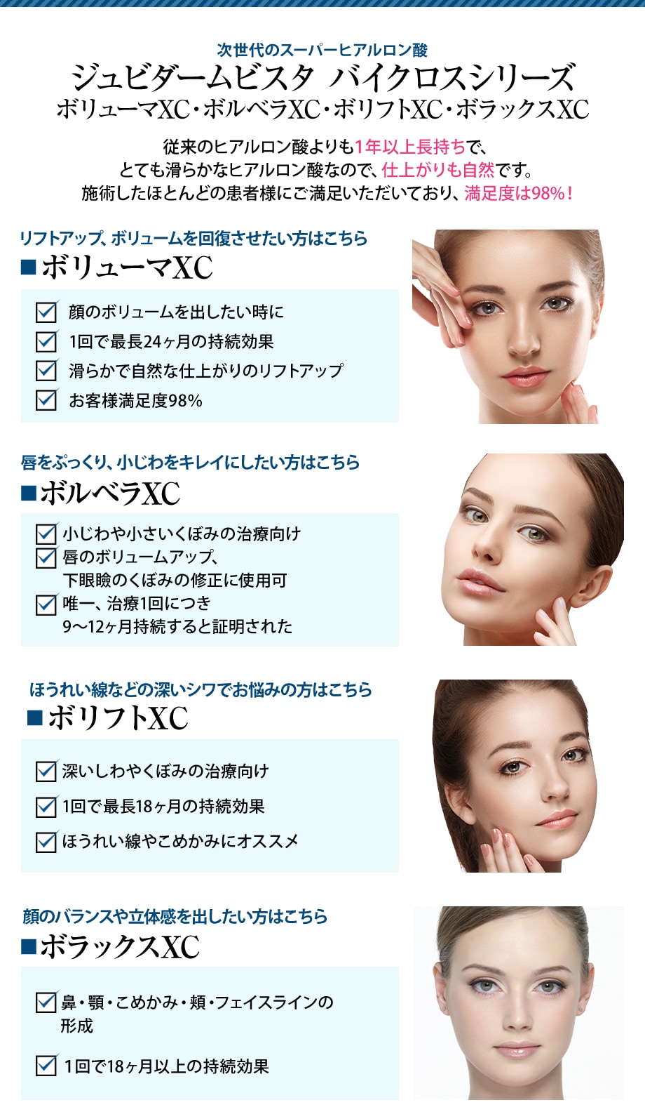 ヒアルロン酸ジュビダームビスタ バイクロスシリーズは厚生労働省で認可がおりた安全性の高いヒアルロン酸です。