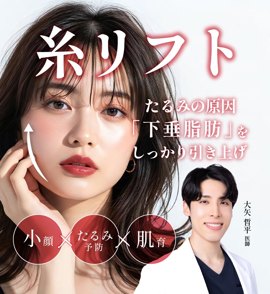 糸リフト(スレッドリフト)は、コグが付いた糸を皮下に挿入し、お顔の垂れ下がった下垂脂肪を直接持ち上げ、高い位置に脂肪を再配置する施術です。