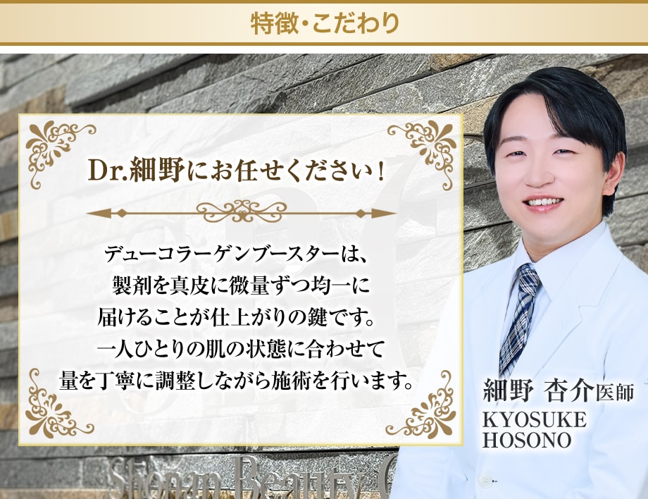 ヒアルロン酸が「注入直後にボリュームを出す」治療であるのに対し、デューコラーゲンブースターは**「コラーゲンの土台を補い、時間とともに肌質を回復させる」** アプローチです。自然な仕上がりで、治療したことが目立ちにくい点も特徴のひとつです。