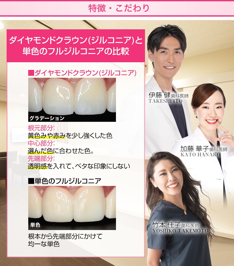 強度が高いフルジルコニアセラミックに、ステイニング(グラデーションの着色)をすることで、天然歯に近い自然な仕上がりにすることができます。