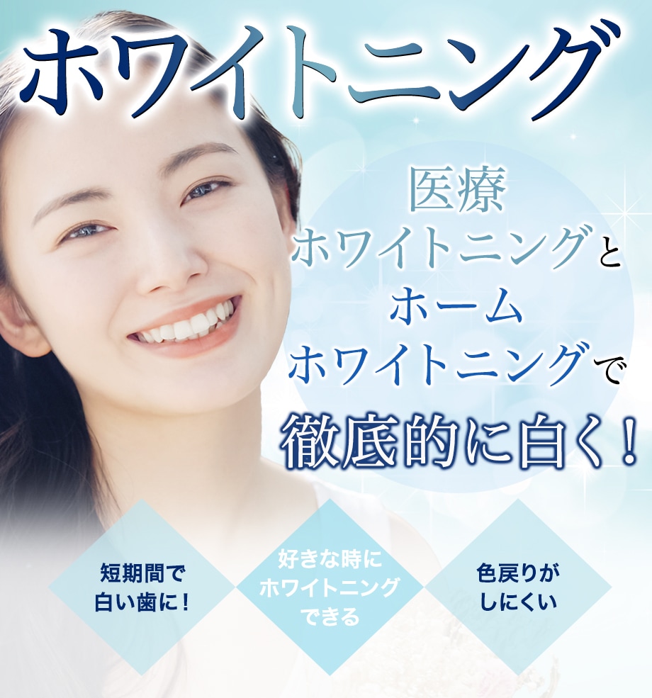ホワイトニングとは、歯を削ることなく、輝く白い歯がよみがえる医療機関でしかできない治療法です。医療機関で行うホワイトニングは、歯の表面の汚れを落とす「クリーニング」に比べ、歯の内側から漂白するので、本来の歯以上の白さを実感できます。