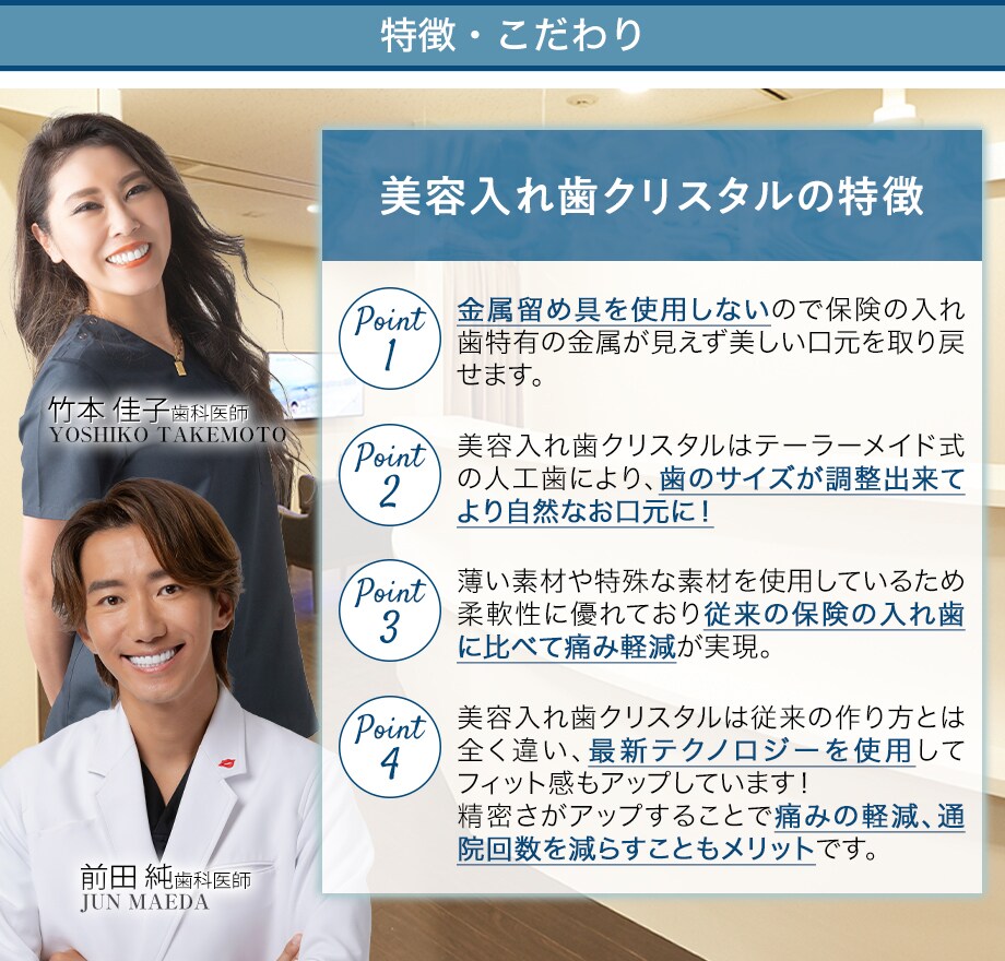 当院取り扱いの美容入れ歯クリスタルは金属留め具を使用せず、透明の義歯床を留め具として使用することで、