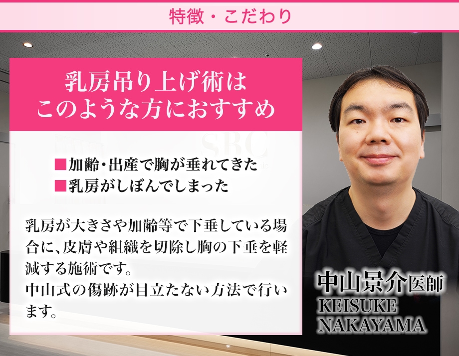 一般的に、胸が大きい方程、加齢と共にバストが下垂してしまうことが多いようです。これは、乳房を吊り上げている筋肉の老化に起因するものです。このような悩みをお持ちの方に湘南美容クリニックがお応えしたものが乳房吊り上げ術です。