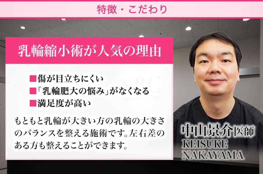 胸全体から比べると乳輪が大きすぎることを「乳輪肥大」と言います。これは、胸の大きい人に比較的多くみられます。乳輪肥大は、遺伝による先天的なものや、胸の発育と共に徐々に現われるものなど様々です。このような胸の悩みをお持ちの方にも湘南美容クリニックがお応えした施術が乳輪縮小術です。
