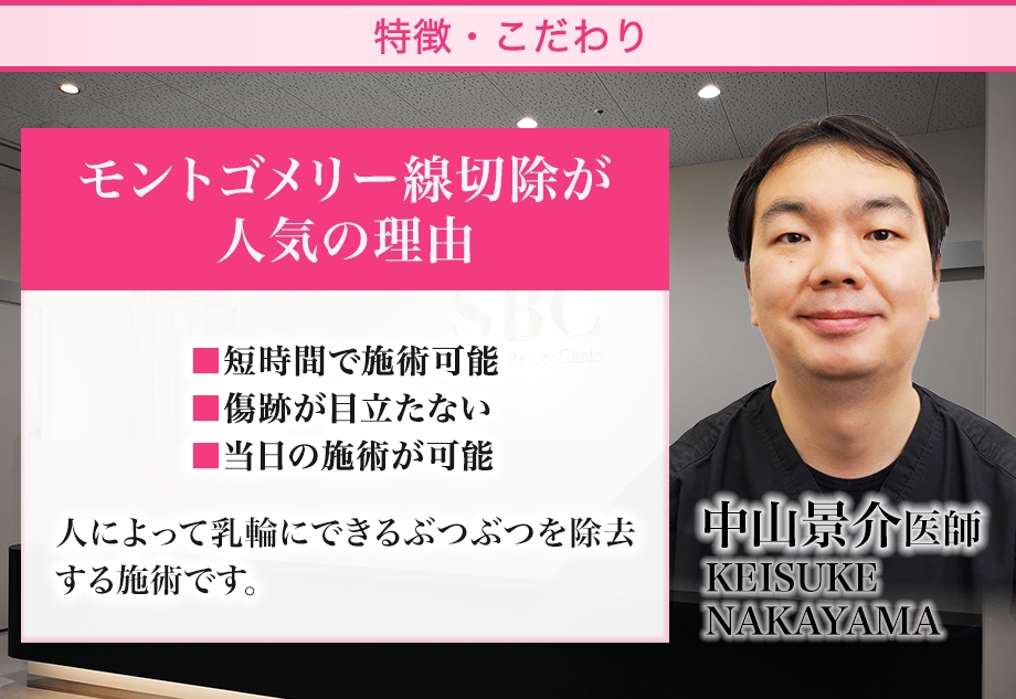人によって乳輪にぶつぶつが出来ることがあります。これは、乳首と乳輪を保護するための皮脂を分泌しているモントゴメリー腺という皮脂腺で一般的にだれにでもあるもので、機能的にもある程度は必要なものです。しかし、モントゴメリー腺が発達しすぎて必要以上に大きくなってしまうことがあります。当院では、体に害のない範囲でモントゴメリー腺をメスで排除し、極細の糸で丁寧に縫合いたします。そのため傷痕をほとんど残すことなくきれいなバストを保つことが出来ます。