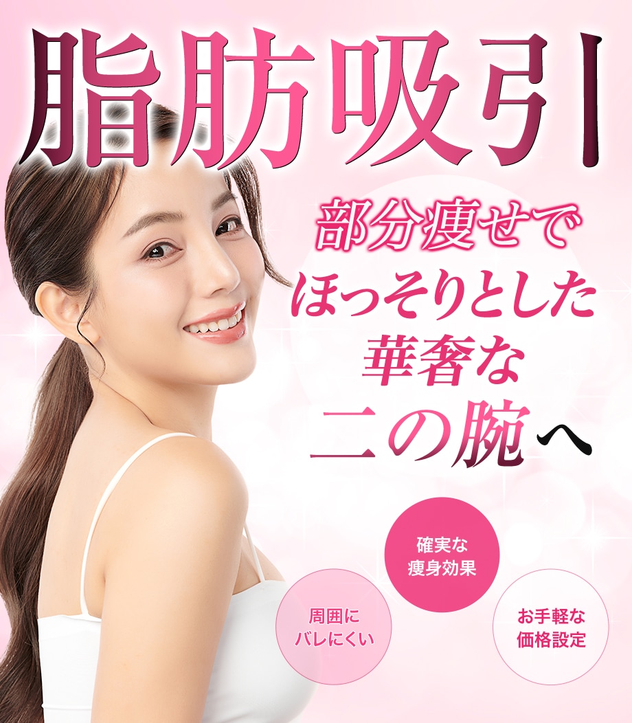 二の腕の脂肪吸引とは、肘のしわや腕の付け根から細いカニューレを挿入し、脂肪を直接吸引することで、二の腕を細くする施術です。傷口は約3mm程度と小さく、カニューレの動きによる摩擦熱や傷の広がりを防ぐ「SBCプロテクト」という保護器具を差し込むため、傷跡はほとんど目立ちません。施術時間は両腕約1時間程度です。お腹や太ももの脂肪吸引に比べると施術時間が短く、ダウンタイムも軽いため、患者さまの身体の負担も少ないです。